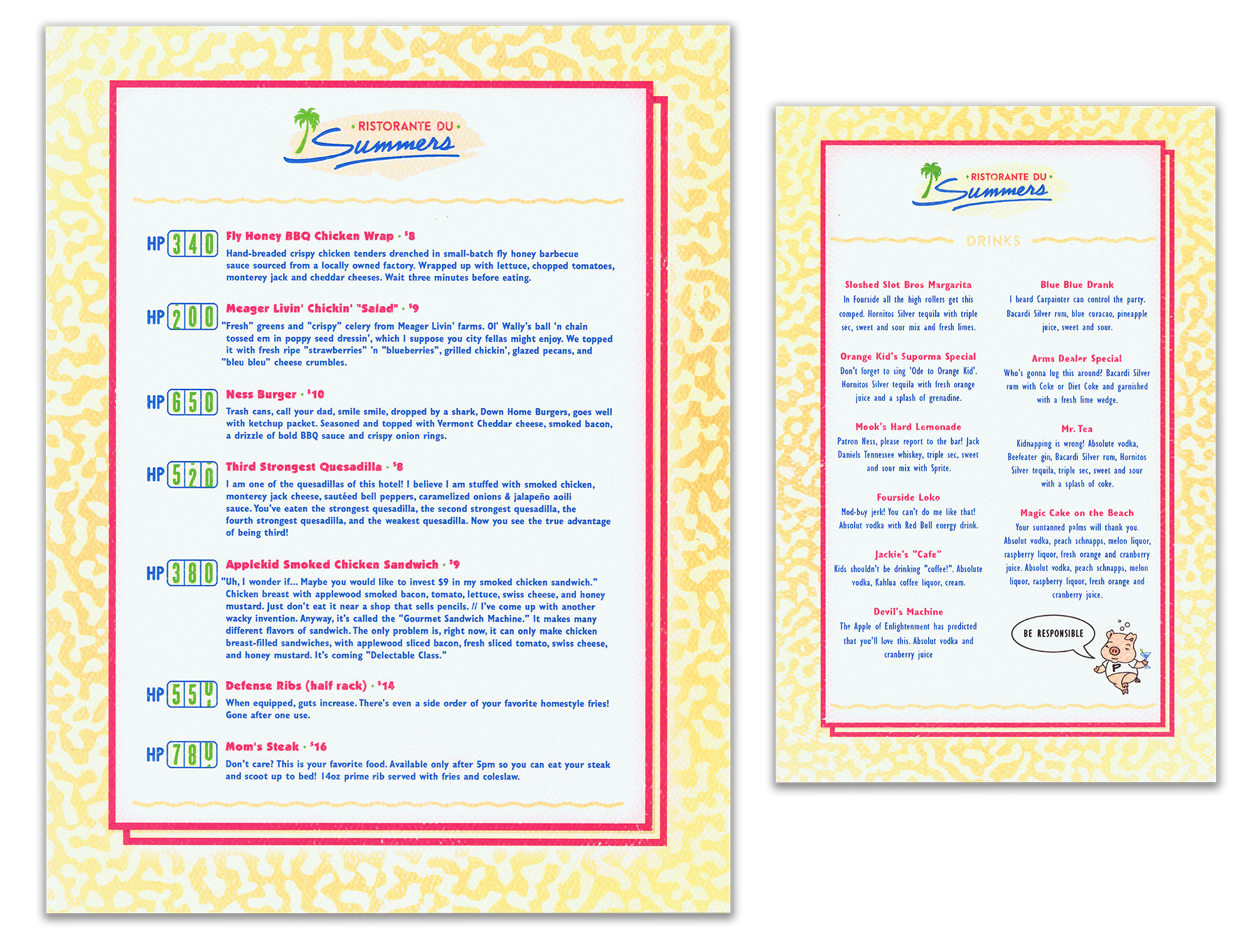 Each camper was given a bag filled with provisions for the journey ahead; items from every corner of the in-game globe: A compass from Dungeon Man, Sunscreen du Summers, a Dusty Dunes wet towel, a bottle opener from Jackie’s “Cafe” in Fourside, a pen from The Blue Church of Happy-Happyist Wisdom, a Postcard from Twoson, a pencil from the Onett Public Library, and a bagged (foam) burger from Down Home Burgers (serving multiple locations across Eagleland). Also included was a Camp Fangamer bandanna and pin, limited edition Camp Fangamer trading cards, the all-important Guide to Twoson, and an ominous packaged pair of slippers cautioning: “break seal in case of Kraken.”