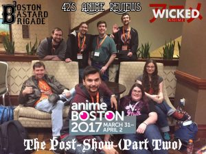 Join Jonathan, Andrew, Evan, Victoria, Christine, Sarah, Derek, Dakota, and Wicked Fan, Tehmsu as we talk about what’s happening in anime how awesome our Anime Boston 2017 was! PLUS – Don’t forget to listen to Part 1 of the Post-Con Podcast over on Boston Bastard Brigade’s website!